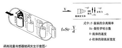 一定雷諾數(shù)范圍內(nèi)(2×104~7×106 ),旋渦的釋放頻率f與流體流速V及旋渦發(fā)生體的迎流面寬度d之間關(guān)系式為f=St?v/d,式中St 為斯特勞哈數(shù),它是一個(gè)無量綱的系數(shù),只要準(zhǔn)確測出頻率f,就可以求得流體流速v,由v求出體積流量。