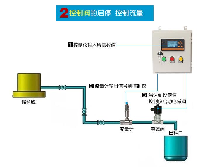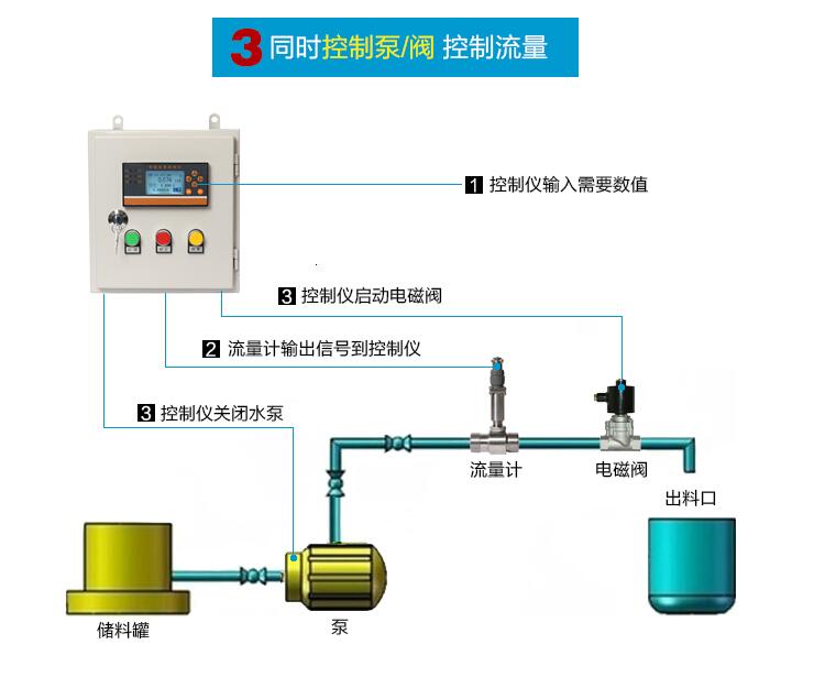 通過流量計測量流量 ,控制儀表接收信號,在控制儀表里設置定量值。定量值達到后電磁閥、水泵 斷電停止工作。