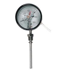 電接點雙金屬溫度計是利用溫度變化時帶動觸點變化,當其與上下限觸點接觸或斷開的同時,使電路中的繼電器動作,從而自動控制和報警。