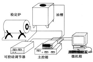 YF100-C熱工自動檢定系統由高精度數字多用表、主控箱、可控硅調節器、微機系統、恒溫裝置(檢定爐和油槽)以及測量導線和通訊導線組成,如圖所示。