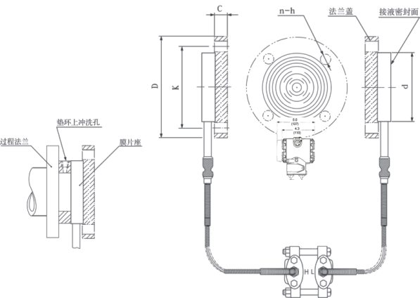 AK-3051DP雙法蘭液位變送器是一種通過安裝在管道或容器上的遠傳裝置來感受被測壓力,該壓力經毛細管內的灌充硅油(或其它的液體)傳遞至變送器的主體,然后由變送器主體內的δ室和放大線路板,將壓力或差壓轉換4~20mA.DC信號輸出(參見結構原理圖)。